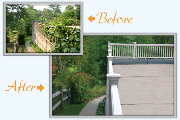 wooden railings with new white composite railing to accent the newly gray stained walls.