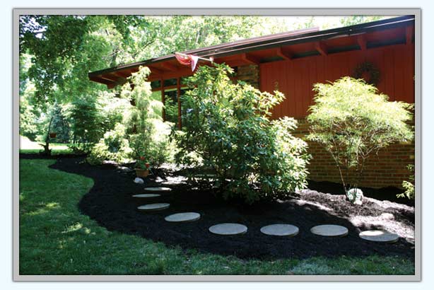 The curved plant bed and the stepping stones leading up to the front door make this entrance very unique.