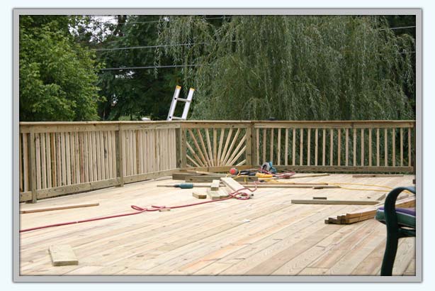 After the deck's surface was completed, we began building the railings. The custom sunburst pattern we created, as pictured above, draws special attention to the 45 degree angles and brings a uniqueness to the entire deck.