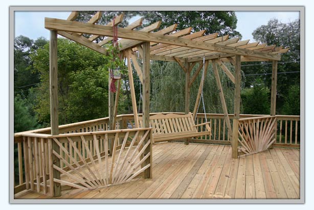 The final step in this deck project was to build a custom swing arbor for the homeowner. We placed this structure in the far corner for optimum viewing from all angles and also incorporated the sunburst design from the deck's railings.