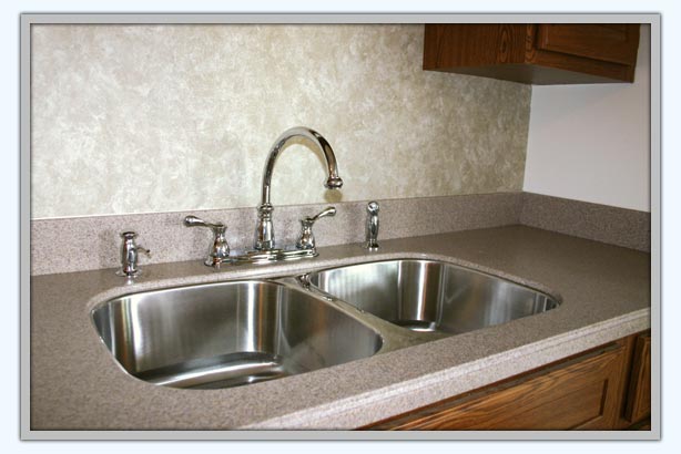 This photo shows the shiny new stainless sink and how it fits perfectly into the custom shaped Corian countertop.
