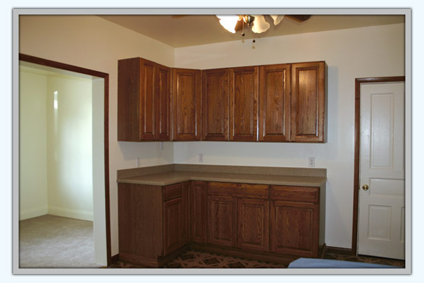 All of these colors, accompanied by the soft light beaming from the new ceiling fan above, create a warm and comfortable atmosphere in the newly remodeled kitchen.